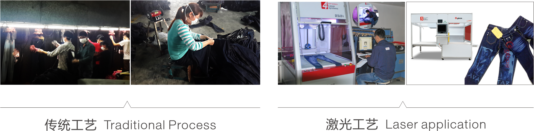 传统的牛仔洗水工艺,有砂洗、石洗、水洗、手动喷砂、磨砂等工艺,这些工艺不但耗水耗材,而且污染极重,严重影响每个工人的安全健康。尤其喷砂工艺,在国外已经明文禁止使用,原因是这种工艺会令工人得上**的肺疾病-硅肺病。